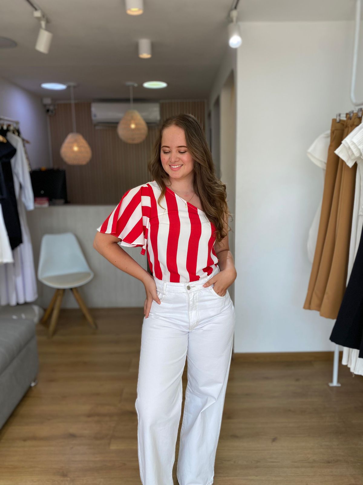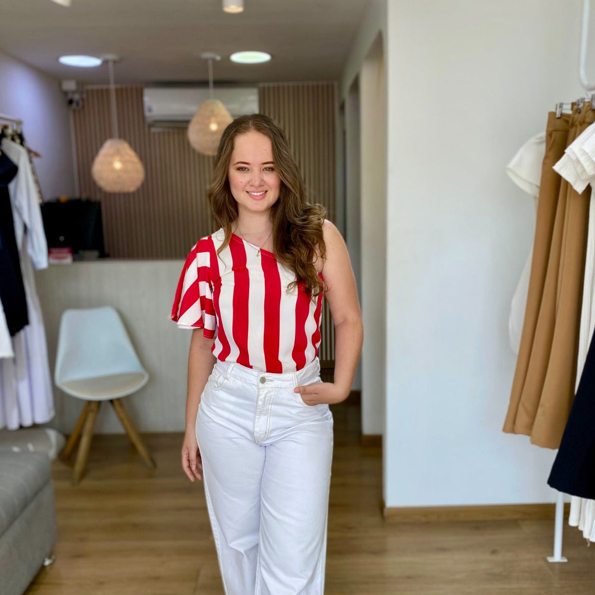 Blusa Taylor roja con rayas, sutil que aporta elegancia, ideal para ocasiones formales o informales.