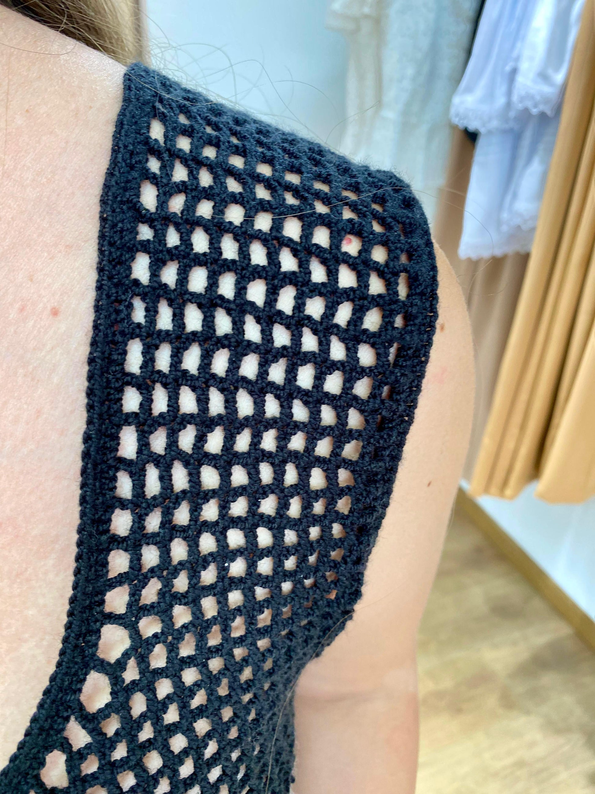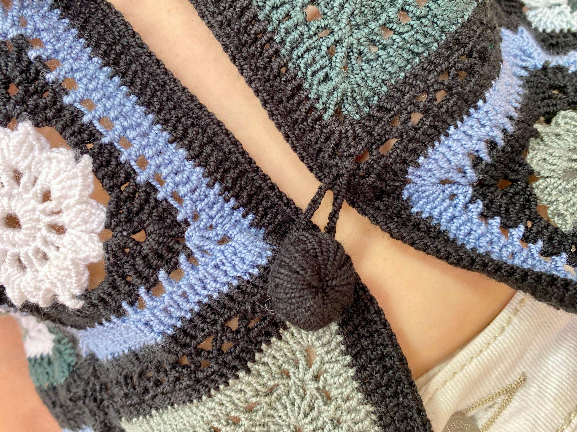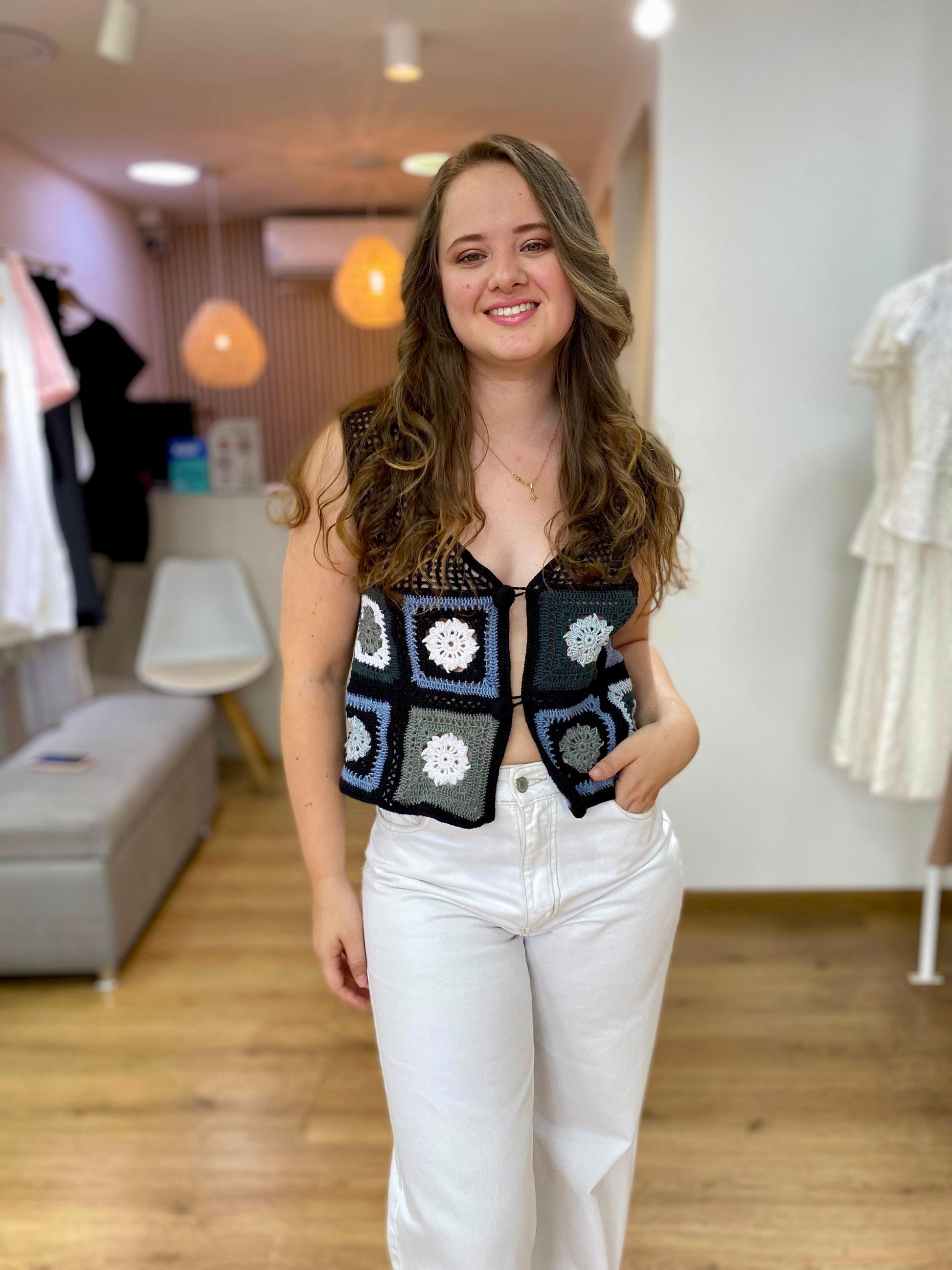 Este chaleco hecho a mano exhibe un detallado diseño floral elaborado con precisión en cada punta.