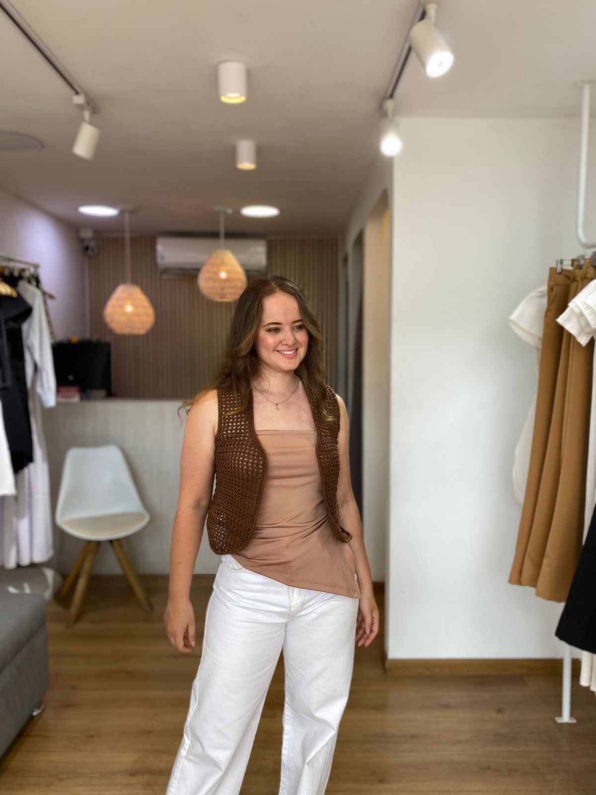 Chaleco tejido en tonos marrones con un diseño de pequeños cuadros, ideal para la temporada de verano.