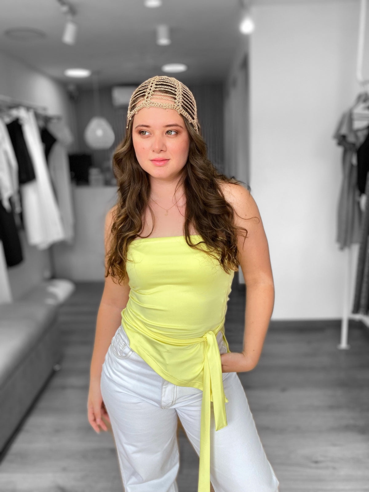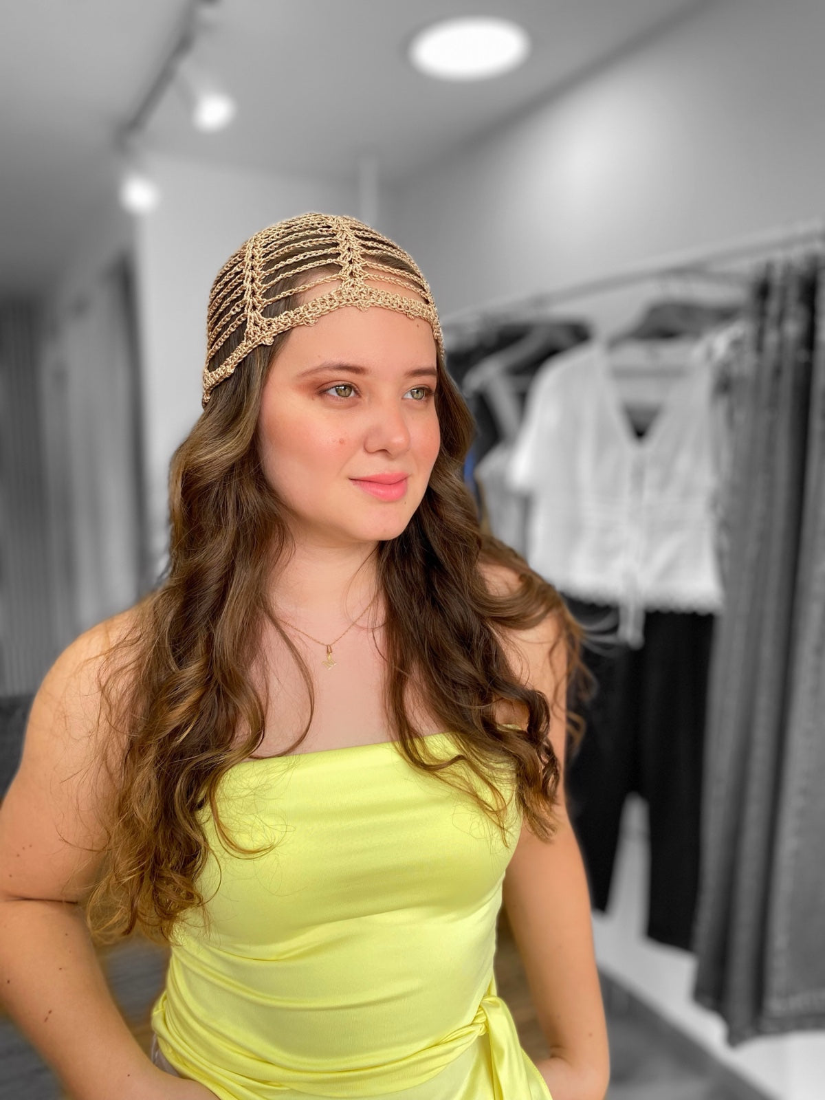 Gorro elaborado a mano con un patrón de líneas abiertas, compuesto por tiras verticales y un borde más denso que rodea la frente, brindando un aspecto delicado y ligero.