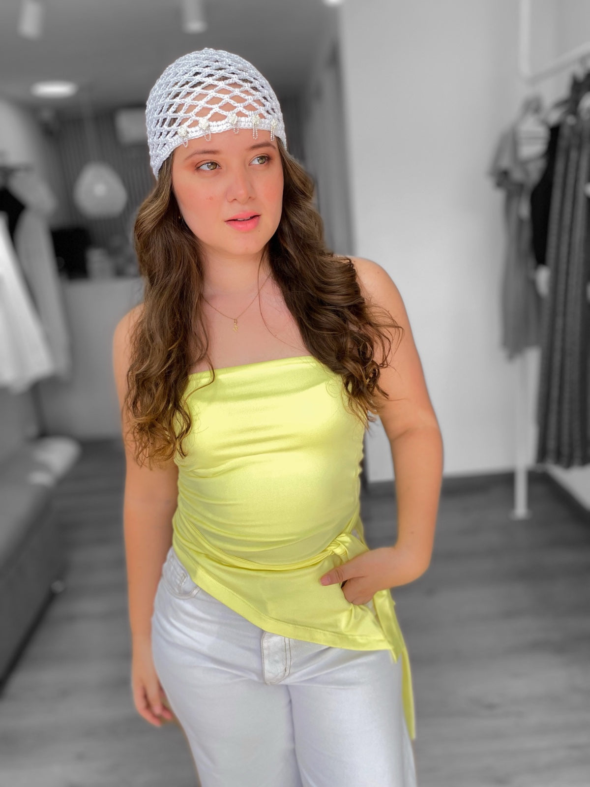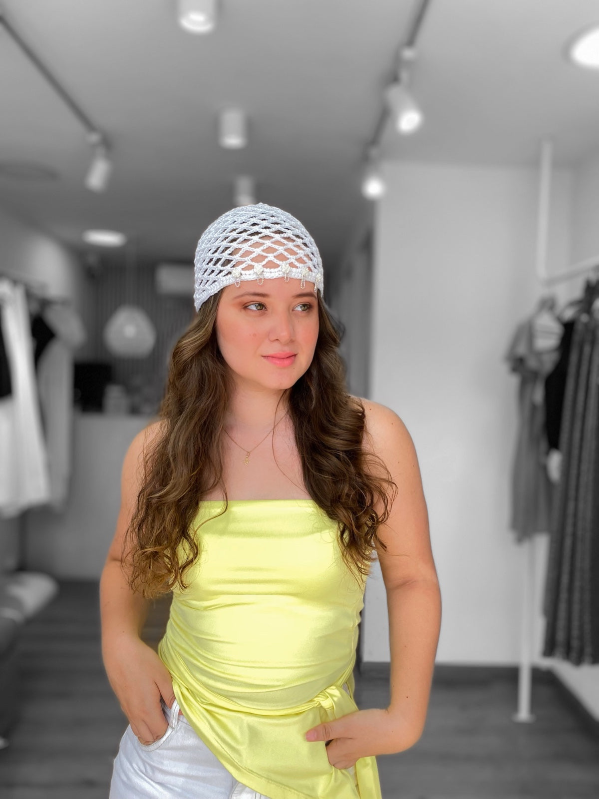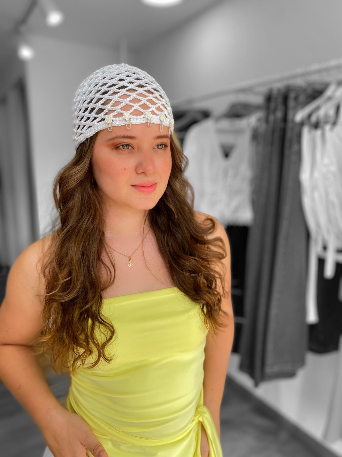 Este gorro tejido presenta una malla con celdas cerradas en un diseño tipo red en la parte frontal. Está decorado con flores blancas y detalles colgantes que imitan perlitas, convirtiéndolo en un accesorio ideal para ocasiones especiales.