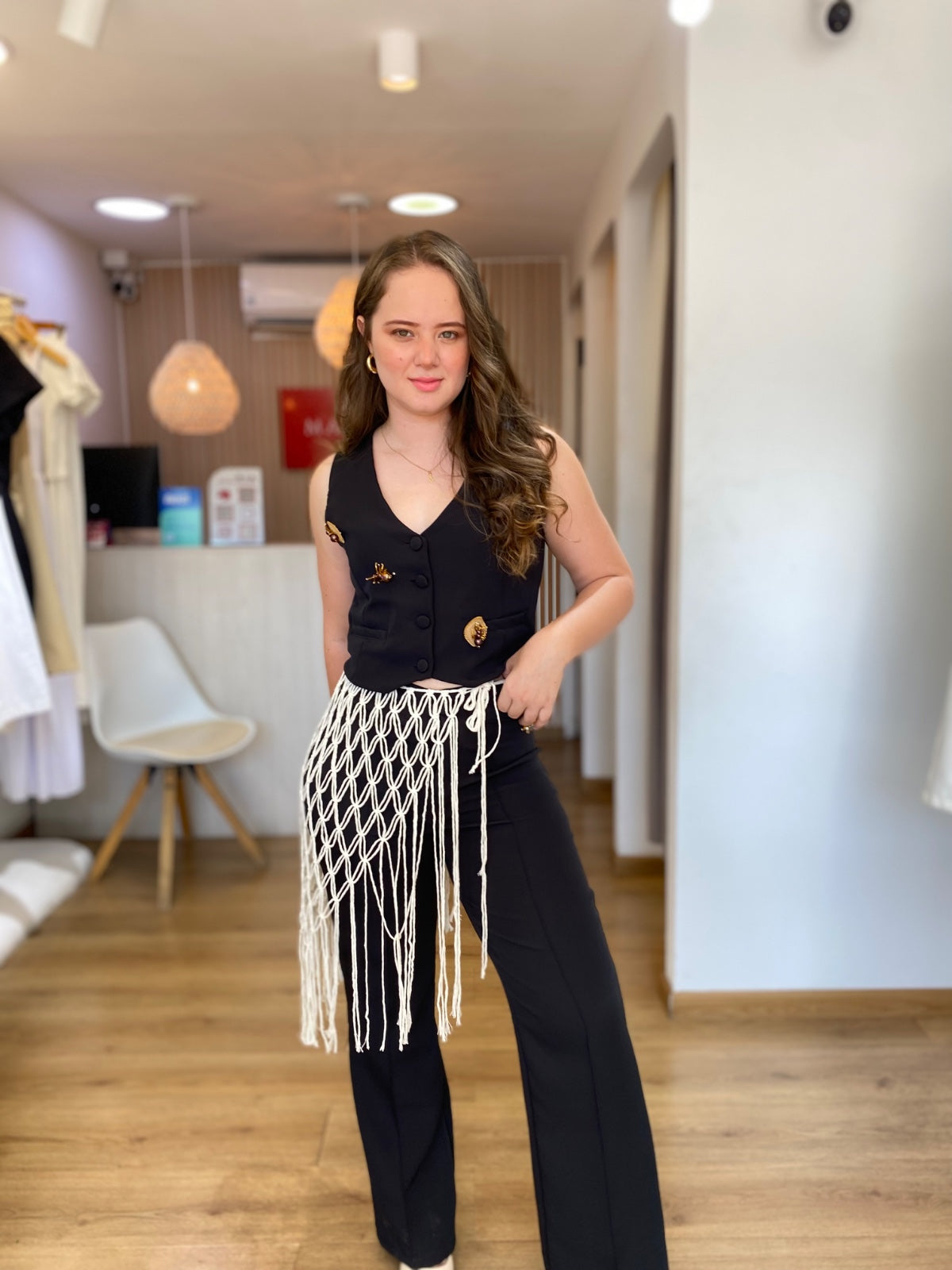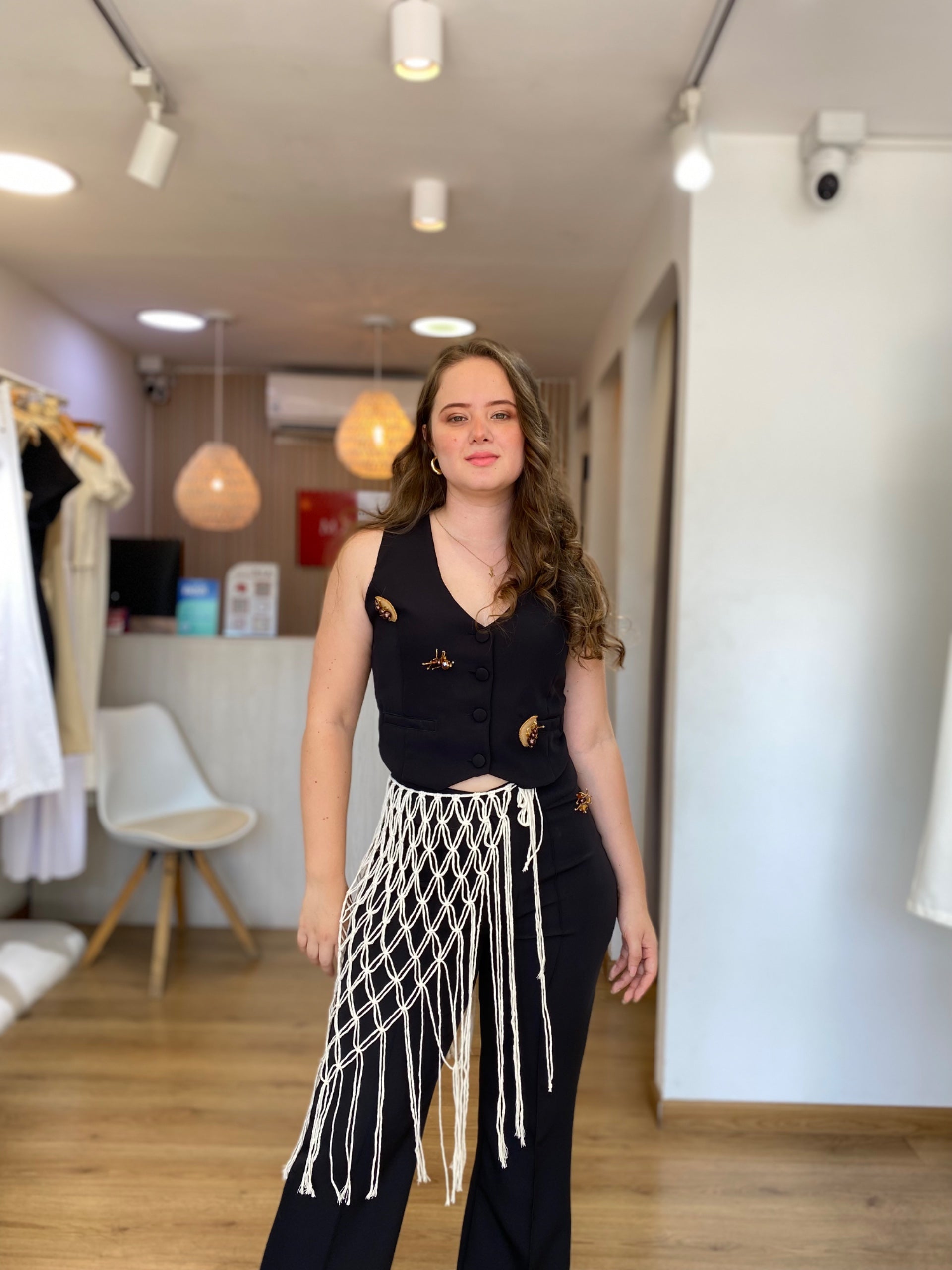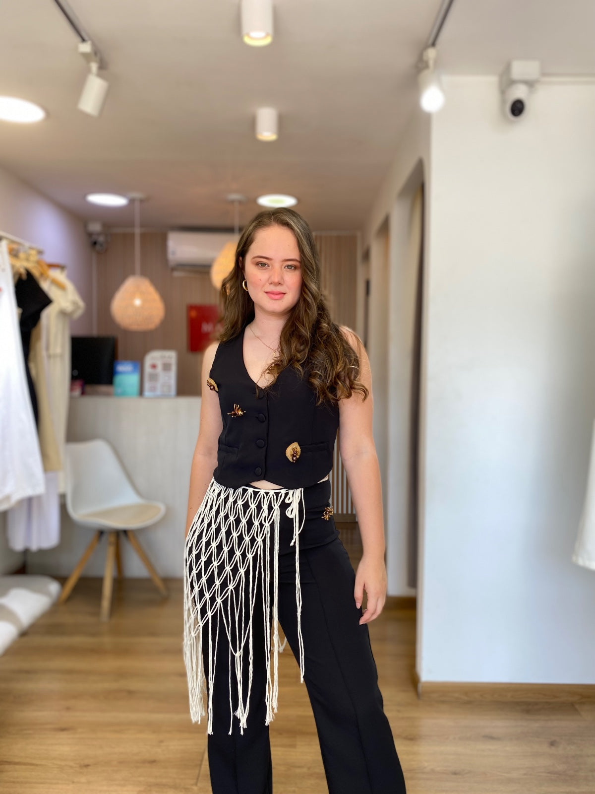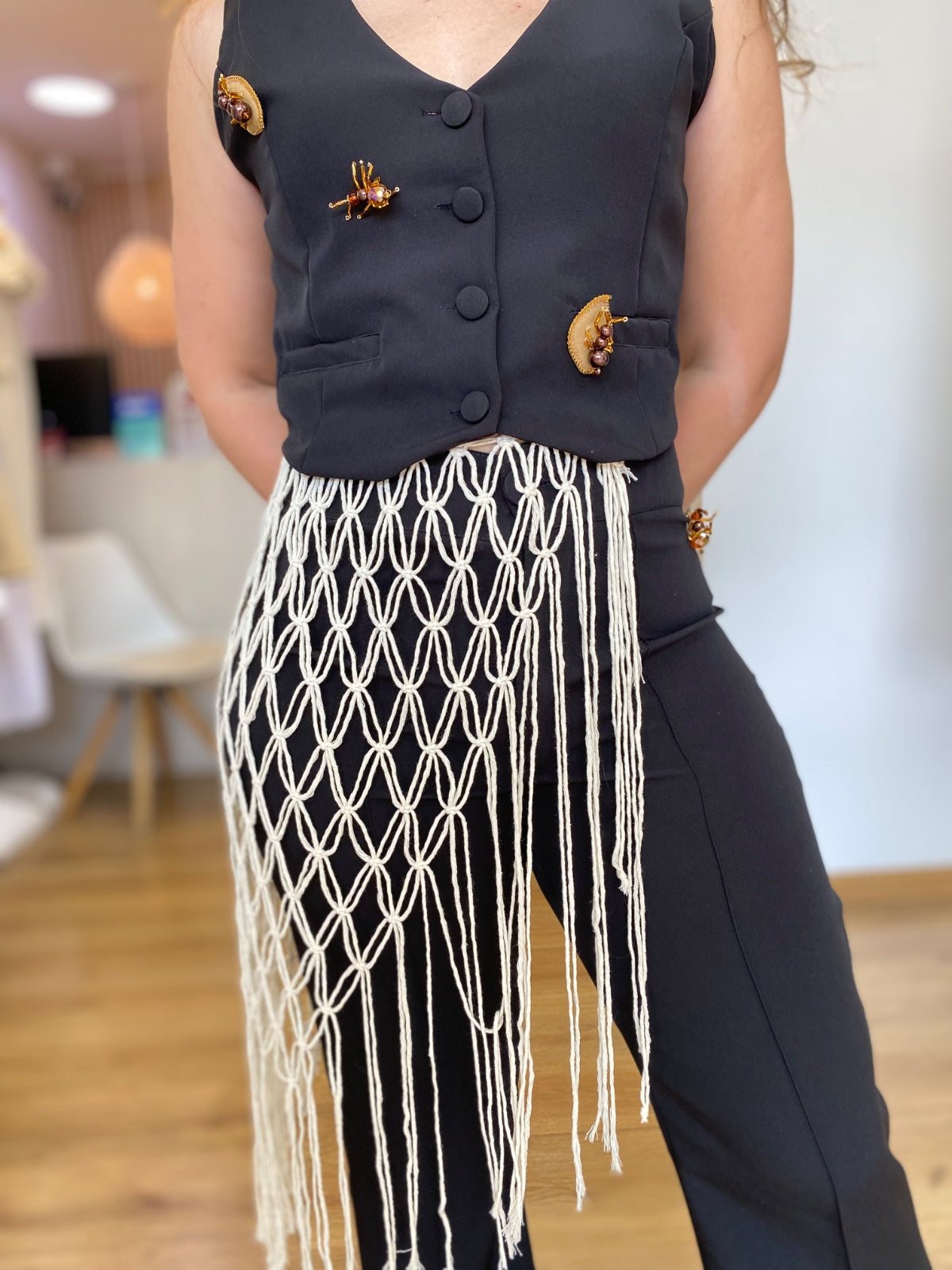 Esta pañoleta beige está elaborada mediante un delicado tejido de nudos tipo macramé, creando un diseño de red que aporta textura y sofisticación. Sus largos flecos caen de manera fluida, añadiendo movimiento y un toque artesanal único. Ideal para complementar atuendos con estilo natural y detallado, ofrece una combinación perfecta entre elegancia y artesanía.