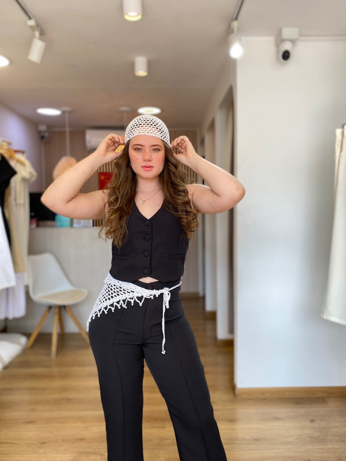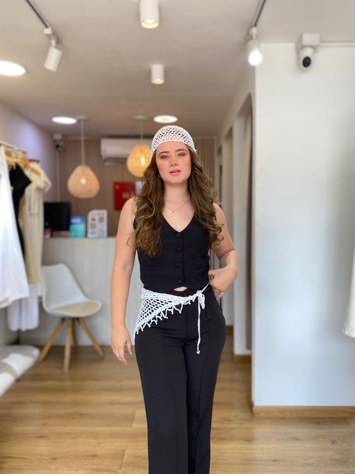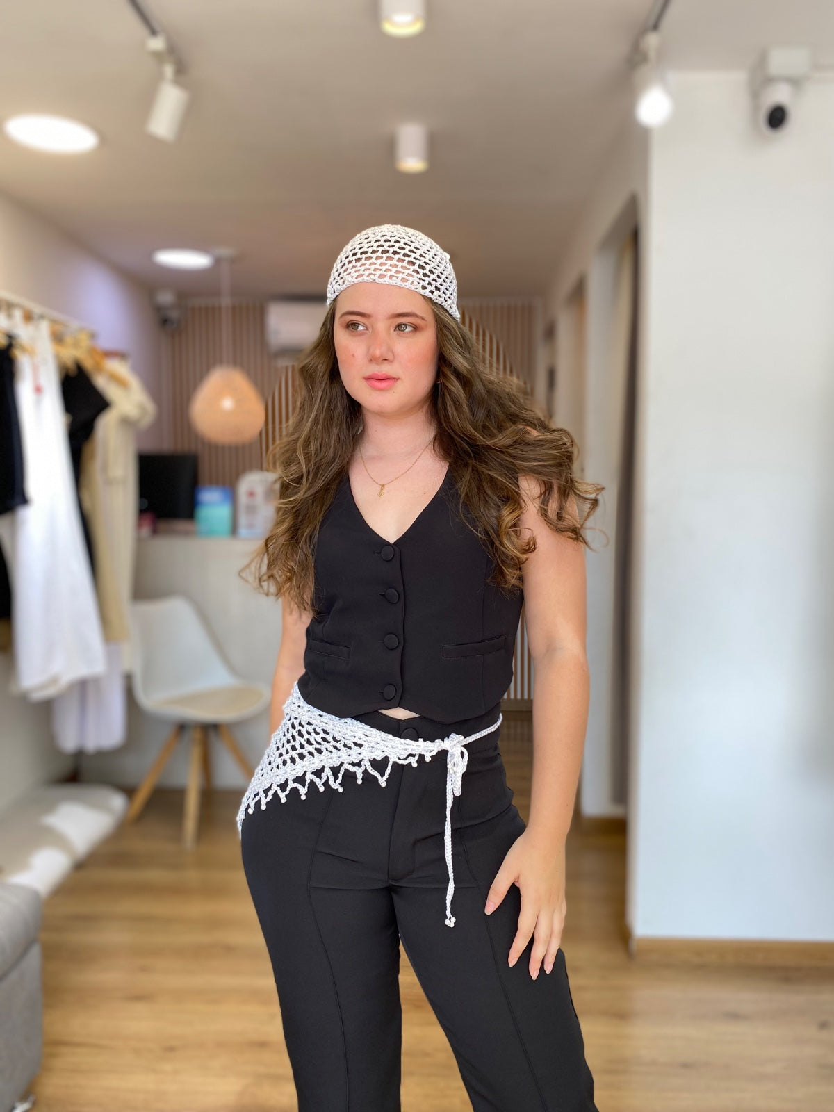 Esta pañoleta blanca presenta un diseño en crochet de malla abierta que ofrece ligereza y frescura. Las perlas blancas decorativas en las puntas añaden un detalle sutilmente brillante, aportando elegancia y sofisticación. Perfecta para complementar atuendos con un toque delicado y distinguido.