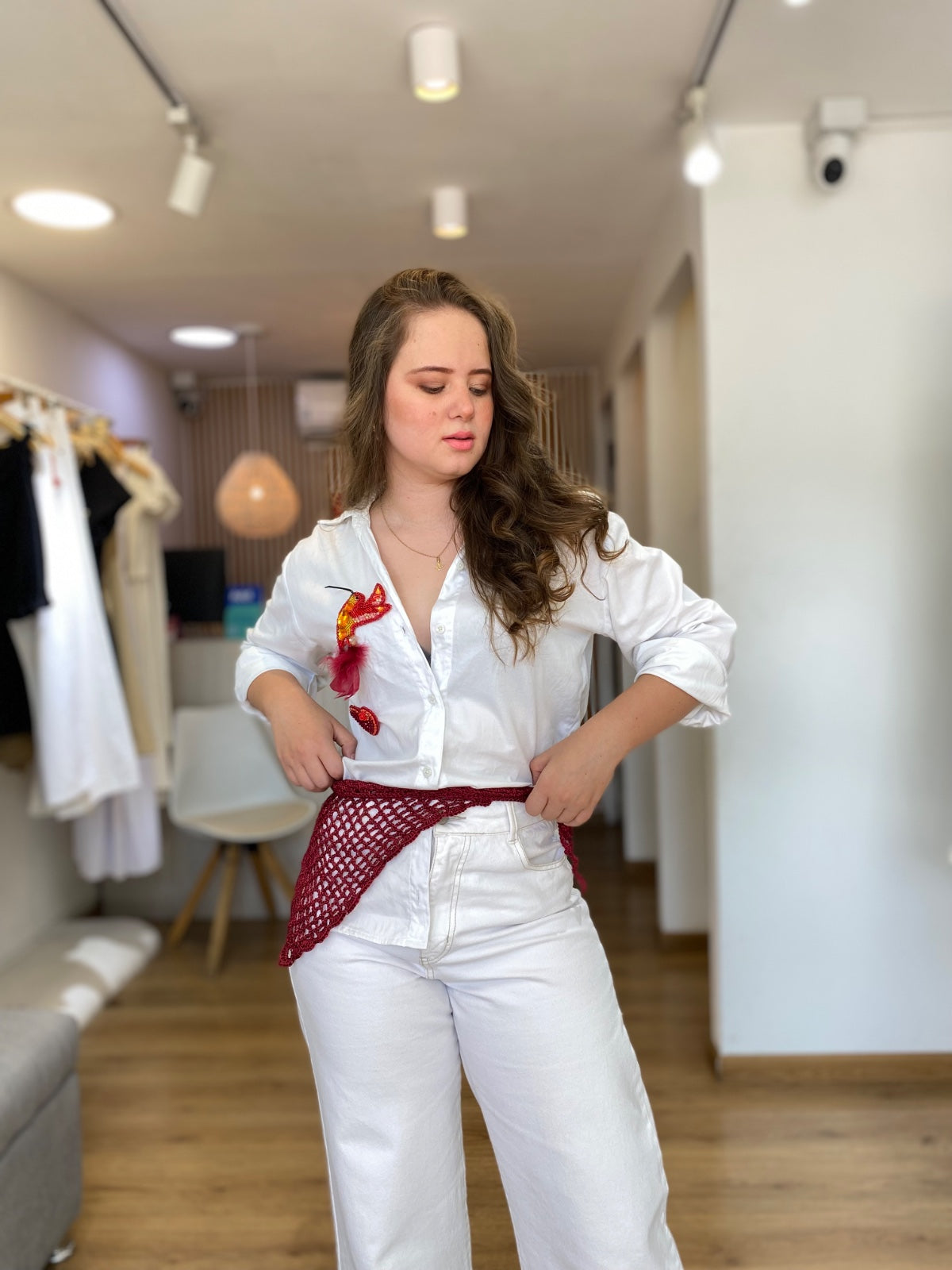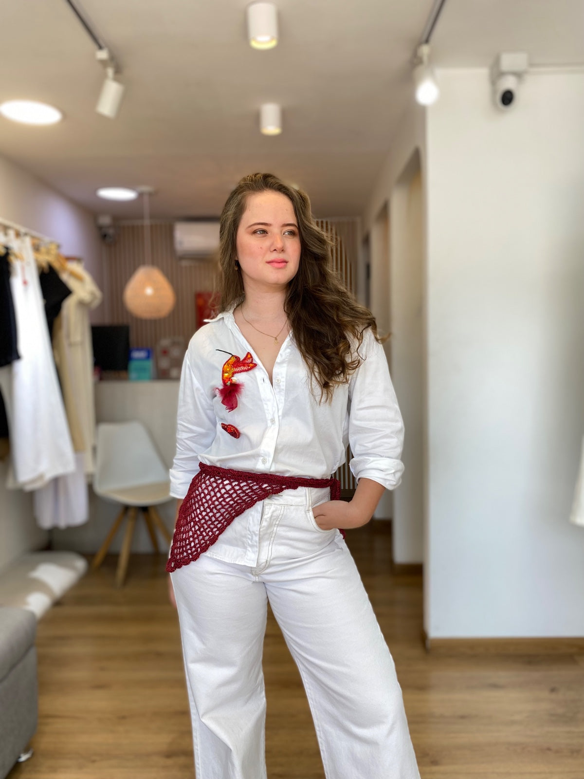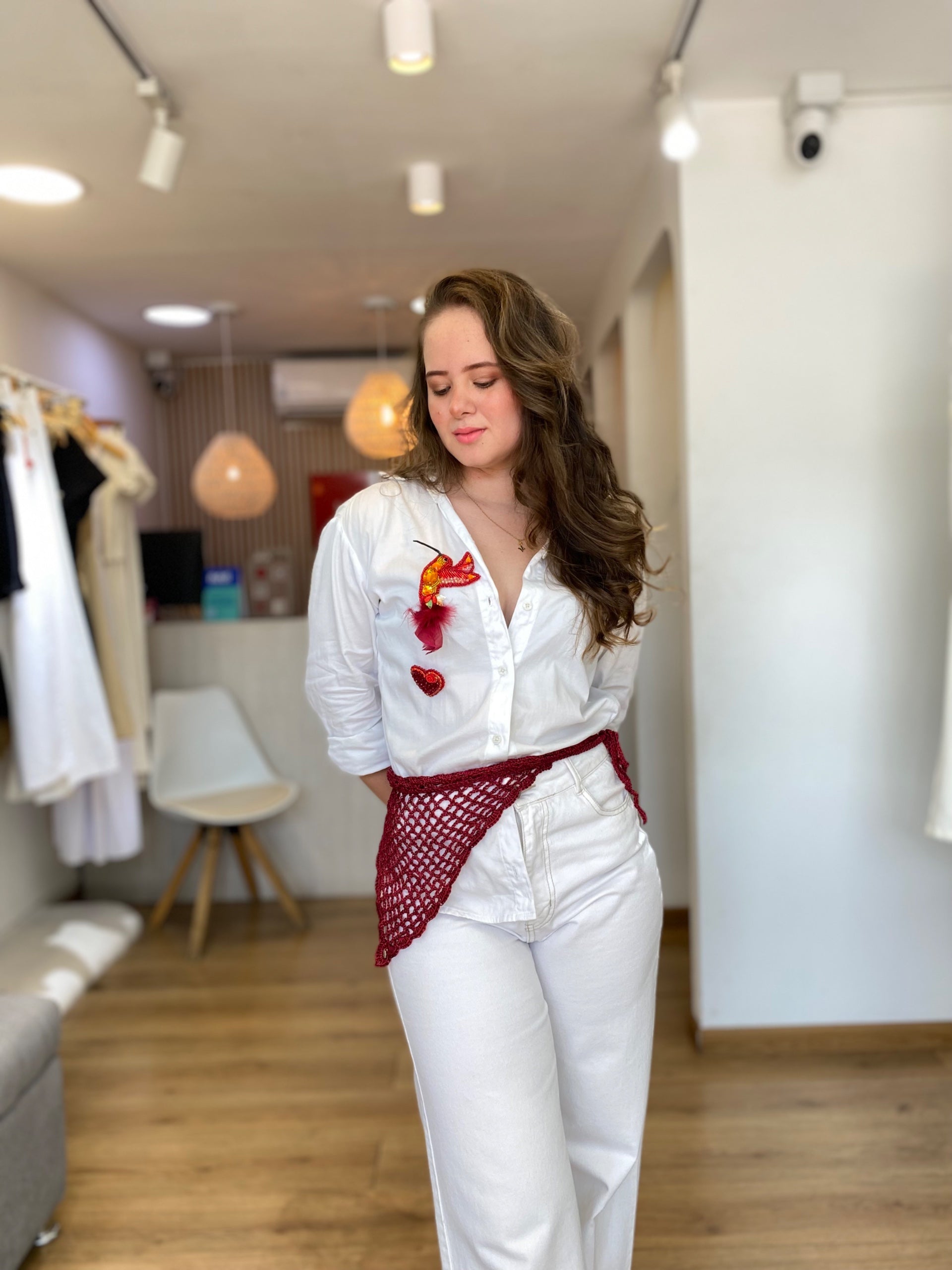 Pañoleta en tono vino tinto, elaborada a mano con crochet en un delicado punto calado y diseño triangular. Su borde presenta un acabado más robusto y definido, sin flecos ni adornos, lo que le confiere una apariencia elegante y discreta.