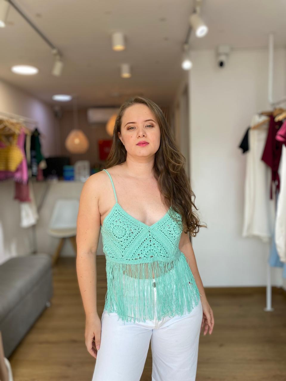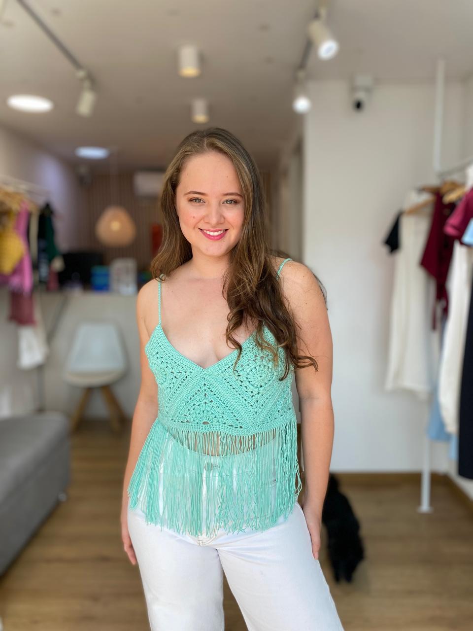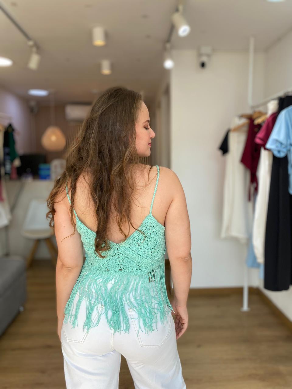 top tejido en color verde menta, de tirantes delgados y escote en V que estiliza la figura. Su diseño geométrico artesanal se complementa con flecos largos en la parte inferior, aportando movimiento y un aire bohemio. Perfecto para looks veraniegos, festivales o días casuales con un toque moderno.
